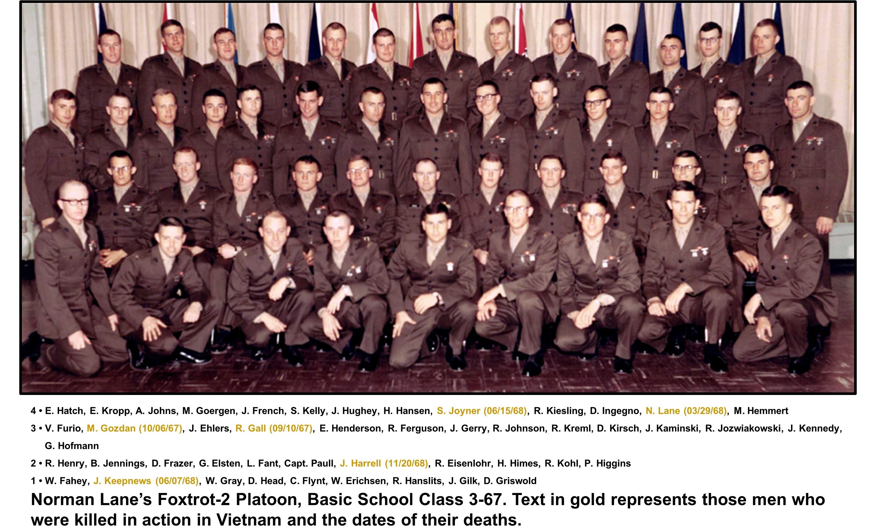 Over the period 2016-2018, I was able to collect more than sixty complete letters that Norman Lane had written to his close Vanderbilt friend Lynn Schiro, his friend Sarah Shepard, and his pen pal Carol Weston; these letters cover the last thirty-nine months of his life—from December 14, 1964, until just before his death in Vietnam on March 29, 1968. To this collection are added two letters that Norman had written to his good friend, fellow Marine, and Vanderbilt law student, John Russell. Of the sixty-five total complete letters, eighteen were written by Norman in Vietnam. After his April 1, 1966, enlistment and the end of the high school spring term, Norman started work on July 5 at a Public Day Camp (as a Nature Study Specialist) in Scarsdale, New York. One of his students there was 9-year old Carol Weston (see above), who today is a very successful writer of children's literature, based in Manhattan. Norman's sister Linda had married on March 12, and their father had tragically been felled by a fatal heart attack on May 16. Norman's petition to reenter Vanderbilt Law School was denied one week later, on May 23. Accepted for Marine Corps OCS at some point between late May and mid-June of 1966, he excitedly wrote to John Russell, already a 2ndLt. in the Marine Corps Reserve, on June 22: John-baby! I got the final word from the Commandant, so it is definite now that I will report to Quantico on Aug. 22nd. . . . Like, is it OK to bring lots of underwear with me, or am I required to wear what they issue? . . . Do I get Christmas vacation? . . . I've decided that when I get out of the Marines, in 1969, I want to finish law school, then get an M.A. in biology.On Friday, August 19, Norman drove through Nashville, en route from his grandparents' home in Brownsville; on August 20, his "Record of Service" was activated at Quantico. "Duty under instruction" with the 41st OCC began on Monday, August 22. Since Norman had first begun classes at Vanderbilt, six years before, the number of US Marines in South Vietnam had risen from two at the end of 1960 to over 69,000 at the end of 1966. No Americans had been wounded or killed in action in Vietnam over 1960, but more than 5,000 men would die in action there over 1966. On September 18, in a letter to Lynn, then-PFC Lane was brutally honest with her as to the physical if not mental stress of the training regimen: But the past week was probably the worst week in my life. And it looks as if things will get worse every week. Just 6 weeks to go. I am being physically wrecked, but I think I can hang on. I have a big exam tomorrow. Will write when I can.Norman did hang on, and he graduated from OCS on Friday, October 28, just nine days after sister Linda’s first son Michael Nicholas was born. Now commissioned as a Second Lieutenant, Norman reported to The Basic School (TBS) at Quantico later that same afternoon. By mid-November, he was able to tell Lynn of the several Vanderbilt acquaintances also at Quantico: I see John [John Russell] pretty often, which is a pleasure. John Wilkes, Joe Myers, Chuck Cherry, Johnny Greenfield, John Holmgren, and Ruff Fant are also all here. Ruff graduated in '63 then went to Harvard Law School. He was a KA [Kappa Alpha fraternity] back then. He is in my platoon and is a really good man. Life at Basic School is easier, so far, than life at OCS.After graduating with TBS Class 3-67 on March 29, 1967, 2ndLt. Lane was assigned to 3rd Battalion, 6th Marines, at Camp Lejeune, North Carolina, and from there he deployed to Guantanamo Bay Naval Base, over May–mid-September. There he met and dated Sarah Shepard, the daughter of a Navy captain stationed at Guantanamo. During this time, Norman also received orders to report to "WestPac (TFAC [transient facility] Camp Butler . . .)"—Camp Smedley Butler, Okinawa—by "1Nov67." "WestPac" invariably meant Vietnam. Those orders were set back by two weeks, and Lt. Lane would leave Camp Lejeune on Friday the 13th—October 13, 1967—for his 30-day pre-deployment leave. He would see friends in North Carolina and Tennessee, including Nashville, and he would visit his mother and grandparents in Brownsville, where he would also say good-bye to the many former high school students there who were among his closest friends. He would also see Lynn Schiro in Memphis; as she said, many years later: Yes, it was the last time I saw him. It was very sad to me, but he was so enthusiastic about the great adventure before him, that it was easier to put aside my worries. And I was very happy that he had come to Memphis to say goodby. Of course, I didn't know that it would be forever. . . .Norman drove his car from Brownsville to New Orleans, said good-bye to his sister Linda and her family, and flew to Denver, where he saw Sarah Shepard, then a college student there. While in Denver, he called his old and best friend Morton Holbrook, then in Ann Arbor, for what would be their last conversation. The next day Lt. Lane flew to San Francisco and Travis Air Force Base, from which he would embark on "the great adventure before him." Vietnam: Wednesday, November 15, 1967–Friday, March 29, 1968Writing to Lynn Schiro on September 27, 1967, from Camp Lejeune, North Carolina, where he was in his last month of pre-deployment training, Norman told her, speaking of the enlisted Marines in his platoon: My platoon is the best in the company, by far. When I say, "What's the word, fourth platoon?" they hold their rifles (M16's) high with one hand and roar, "Kill!" Their morale is very high, even though they know 35 to 50% will die in Viet Nam.Allen Willyerd had grown up in Brownsville but had reported to Parris Island, South Carolina, for basic training with the Marine Corps in early September, 1966, less than two weeks after Norman had reported to Quantico. Though Allen was five years younger, he and Norman had become friends in Brownsville, during the summers that Norman had spent there with his grandparents. Follow